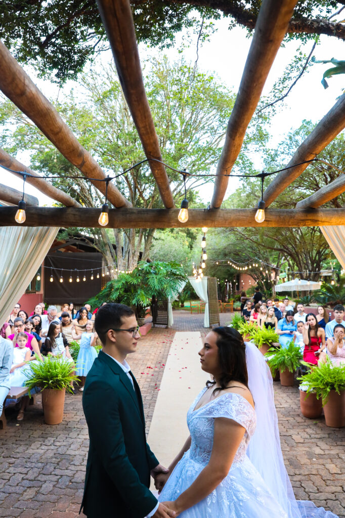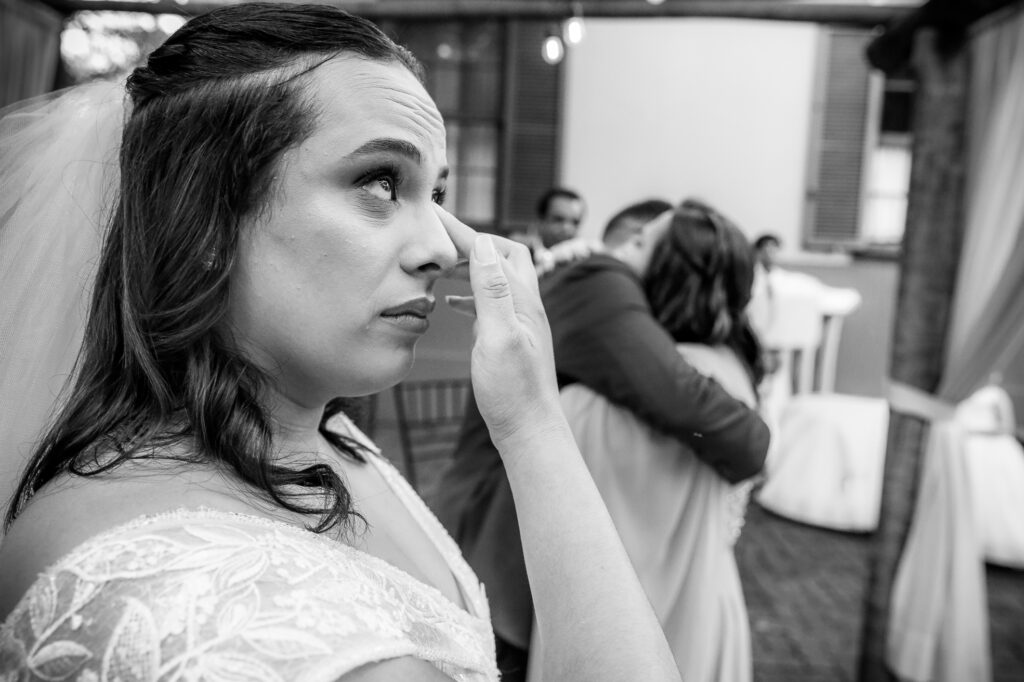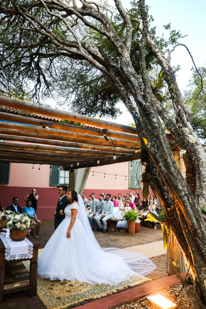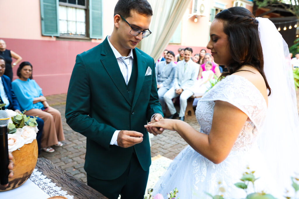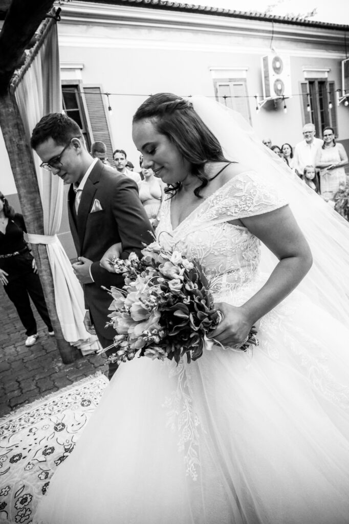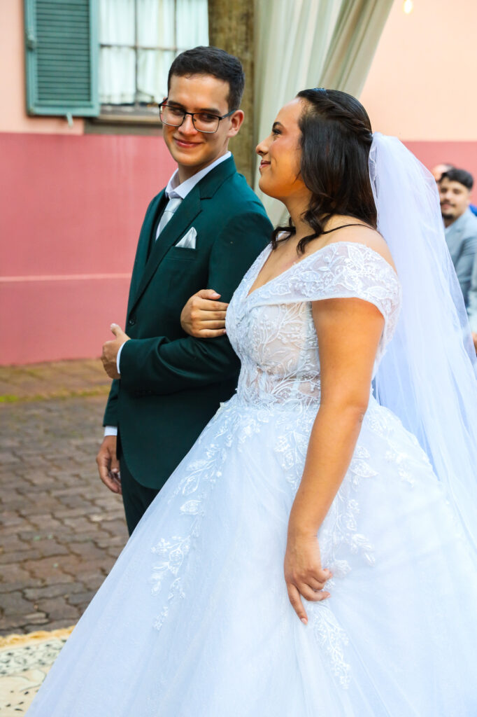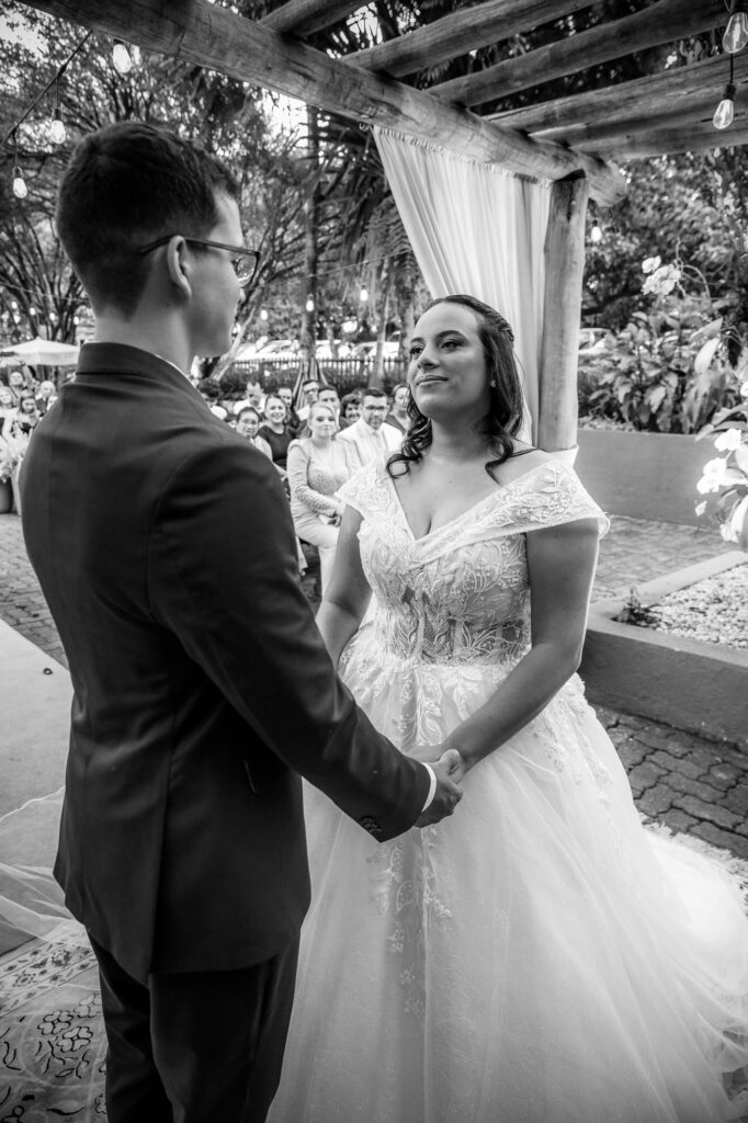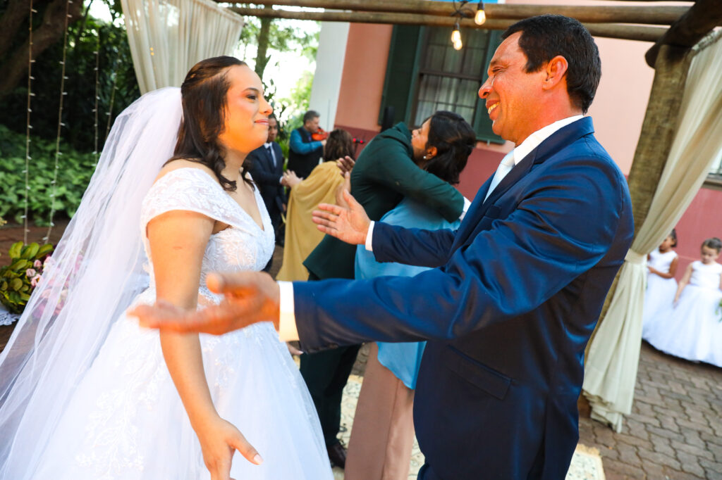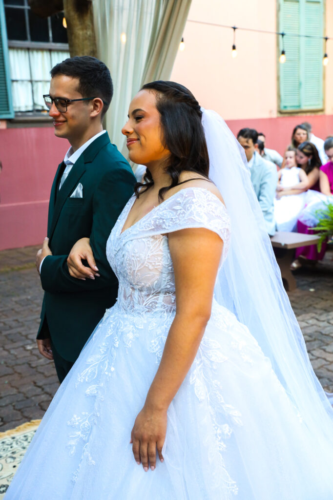 A Ana estava nervosa no começo, até chorou antes de entrar na cerimônia, mas assim que viu o Eduardo, tudo se encaixou e ela sorriu.