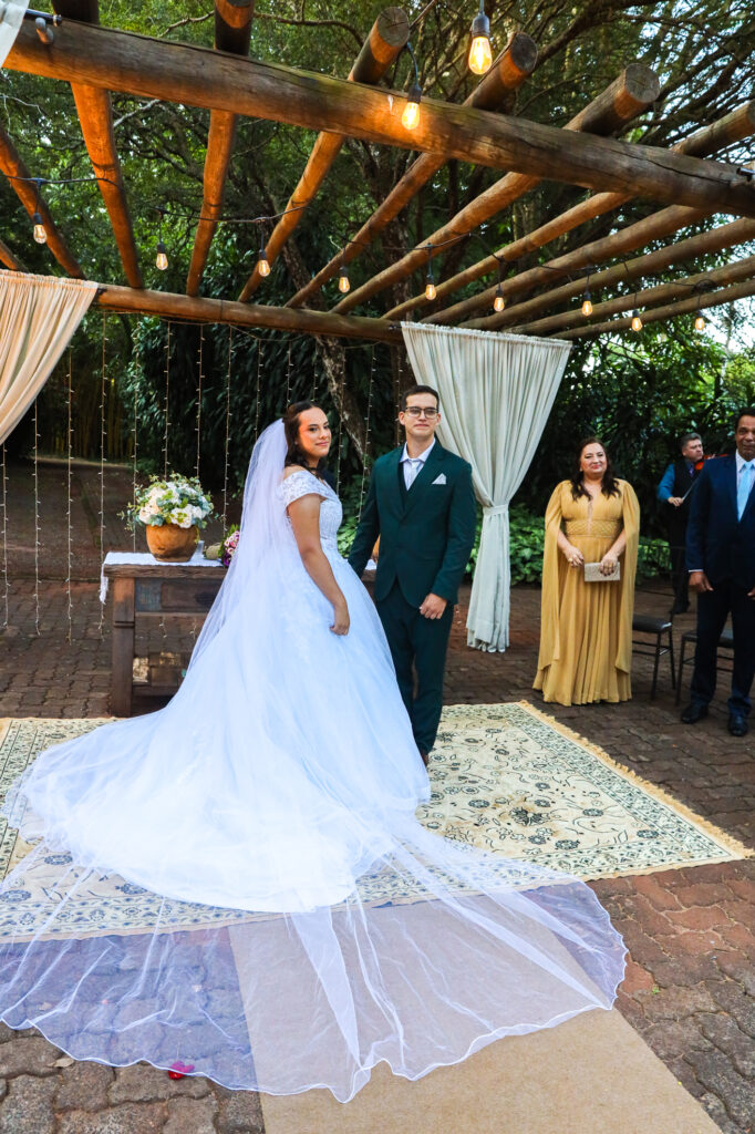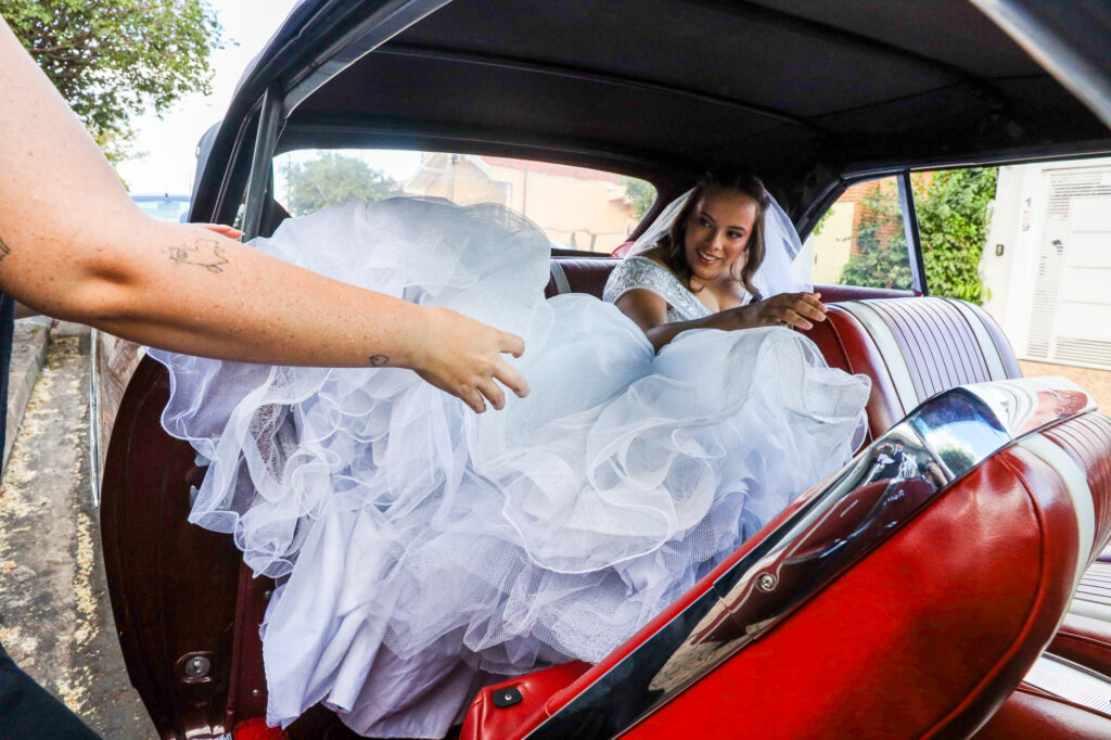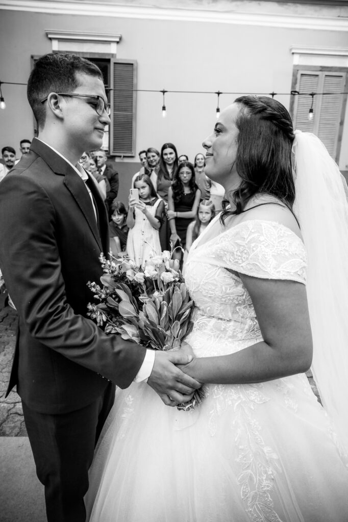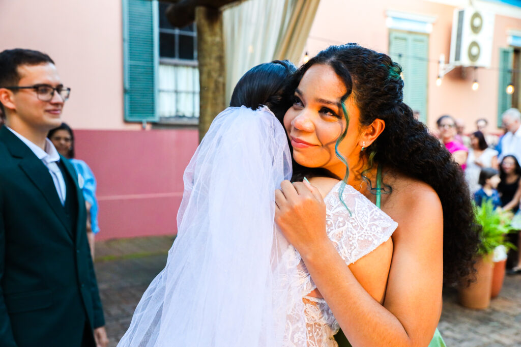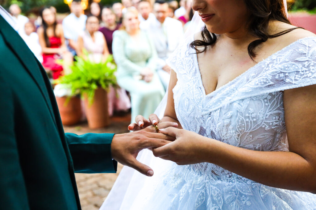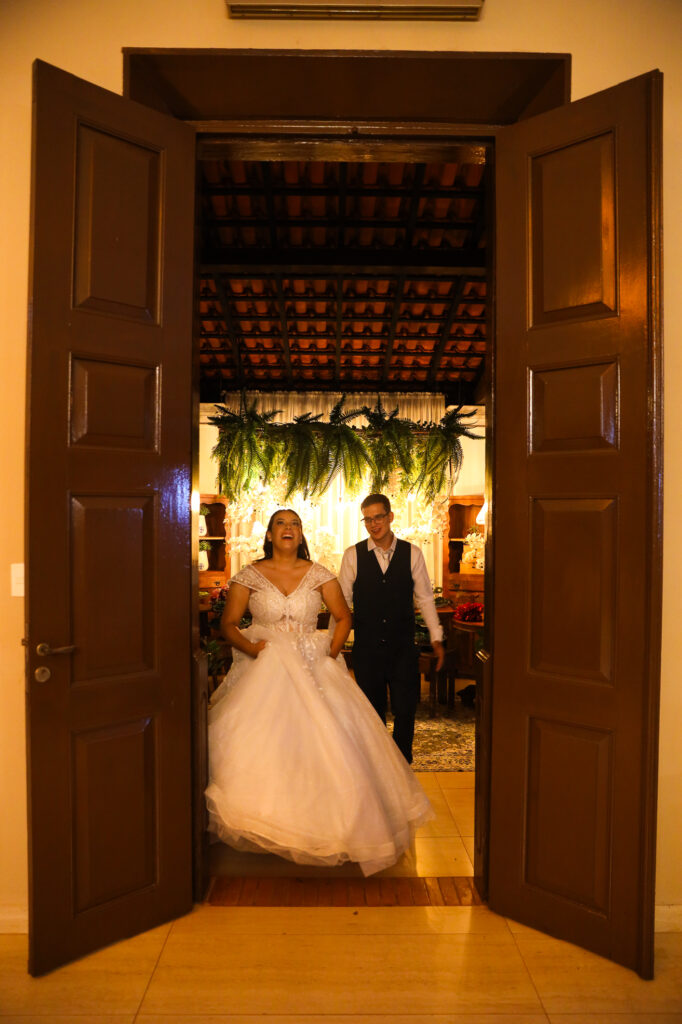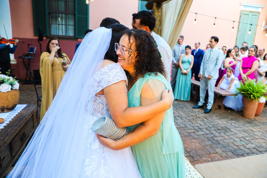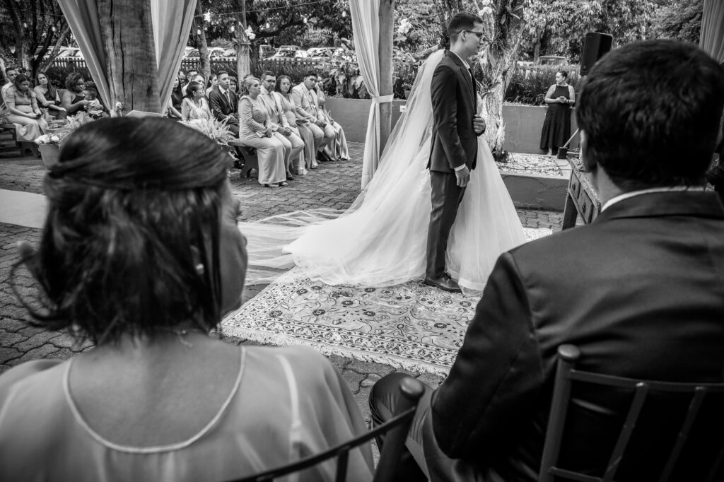 A Ana estava nervosa no começo, até chorou antes de entrar na cerimônia, mas assim que viu o Eduardo, tudo se encaixou e ela sorriu.