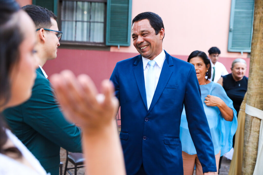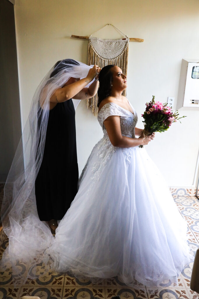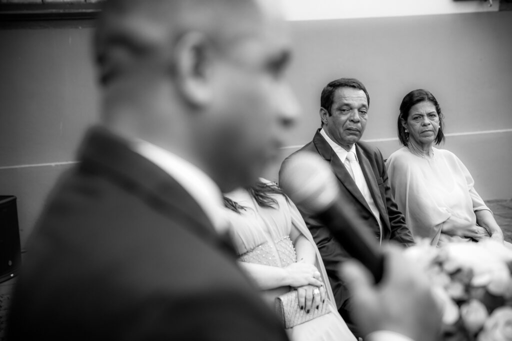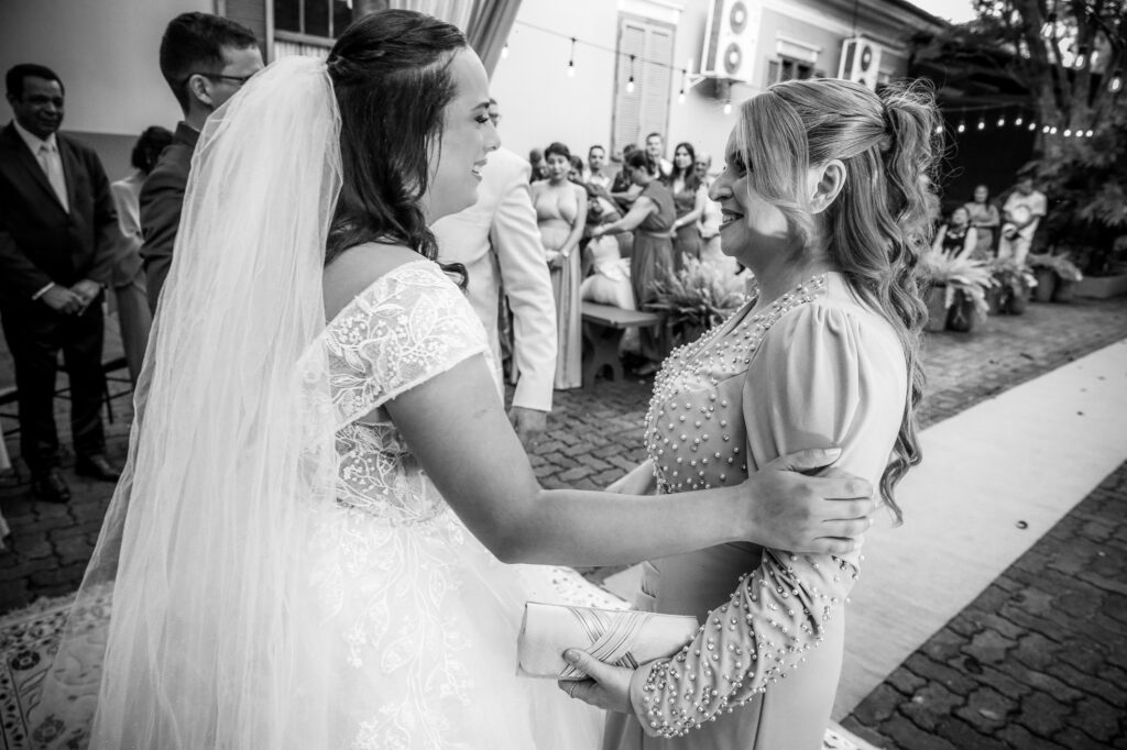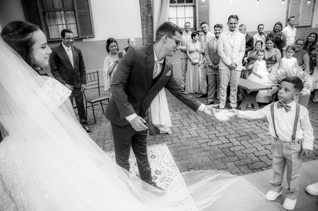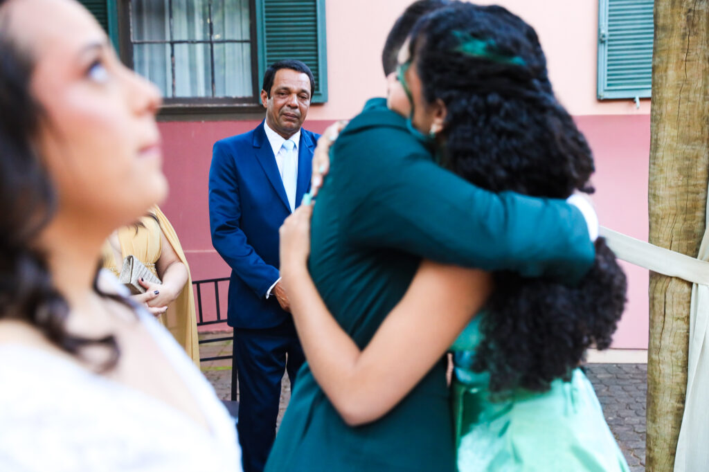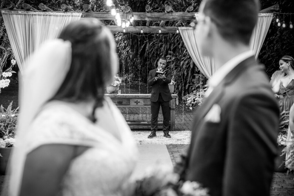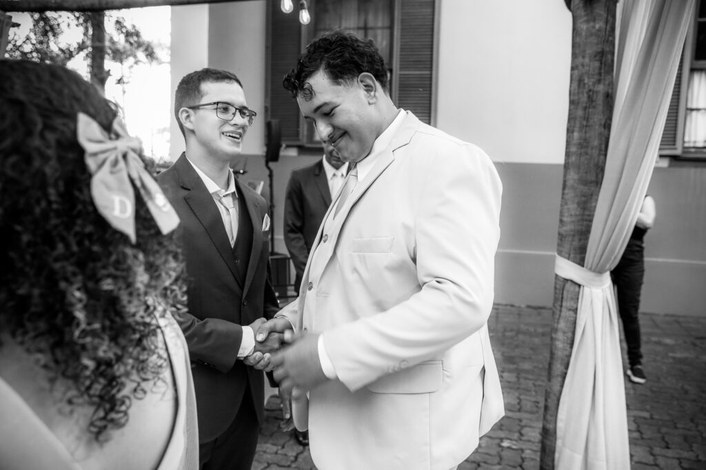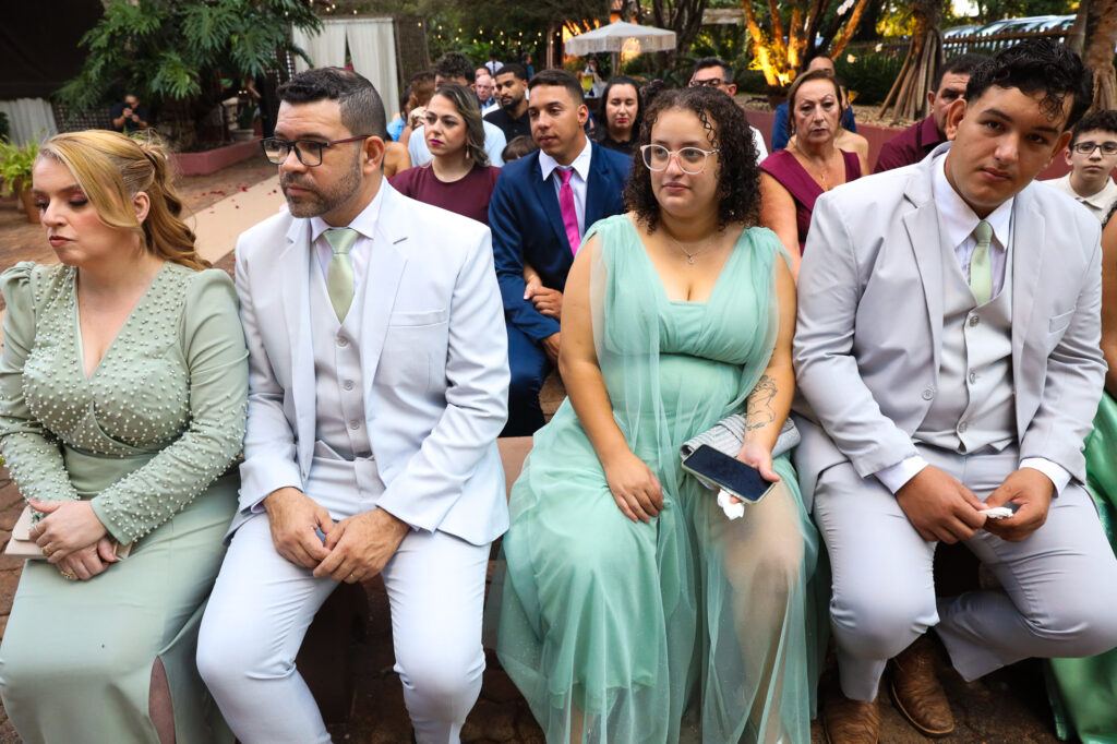 A Ana estava nervosa no começo, até chorou antes de entrar na cerimônia, mas assim que viu o Eduardo, tudo se encaixou e ela sorriu.