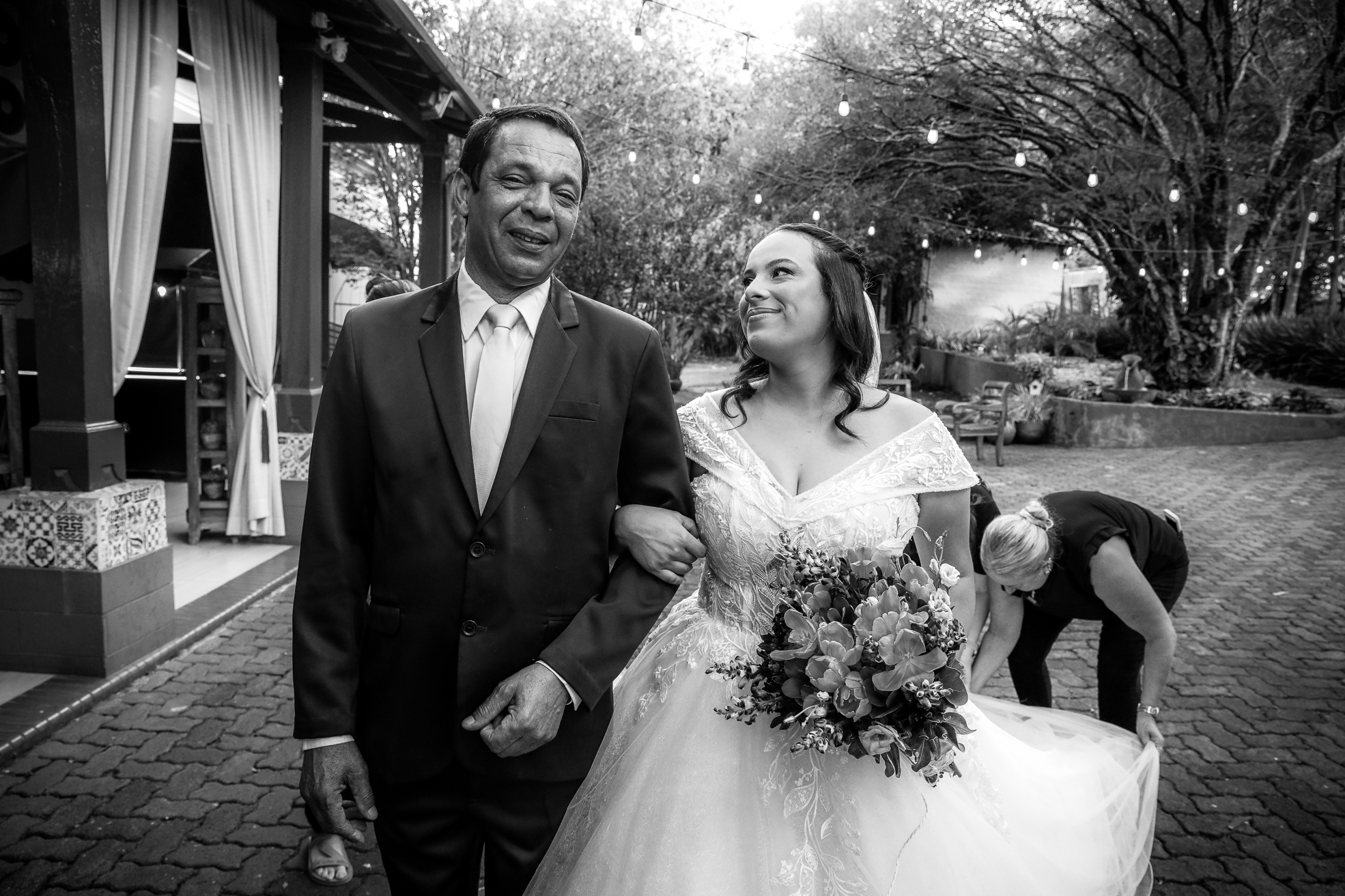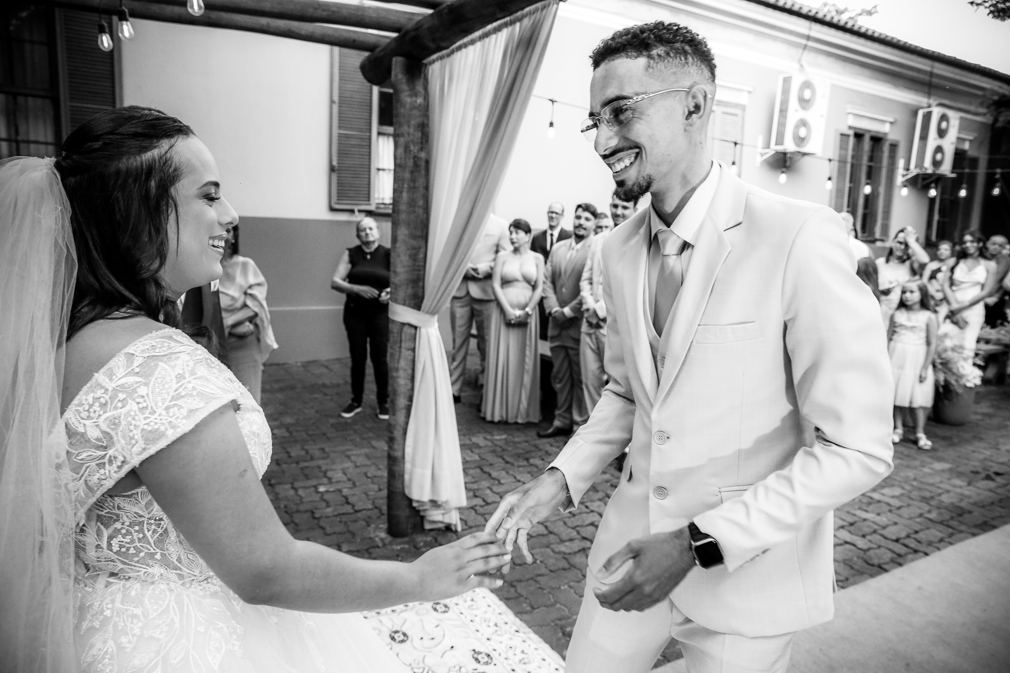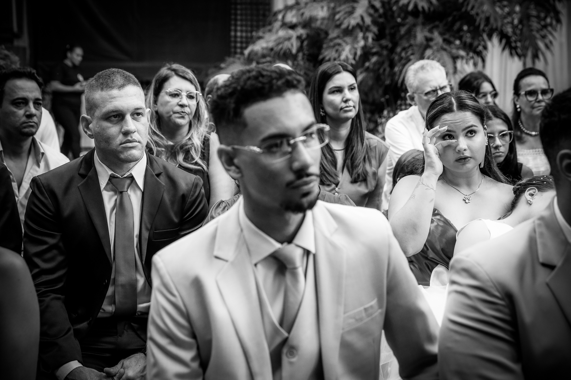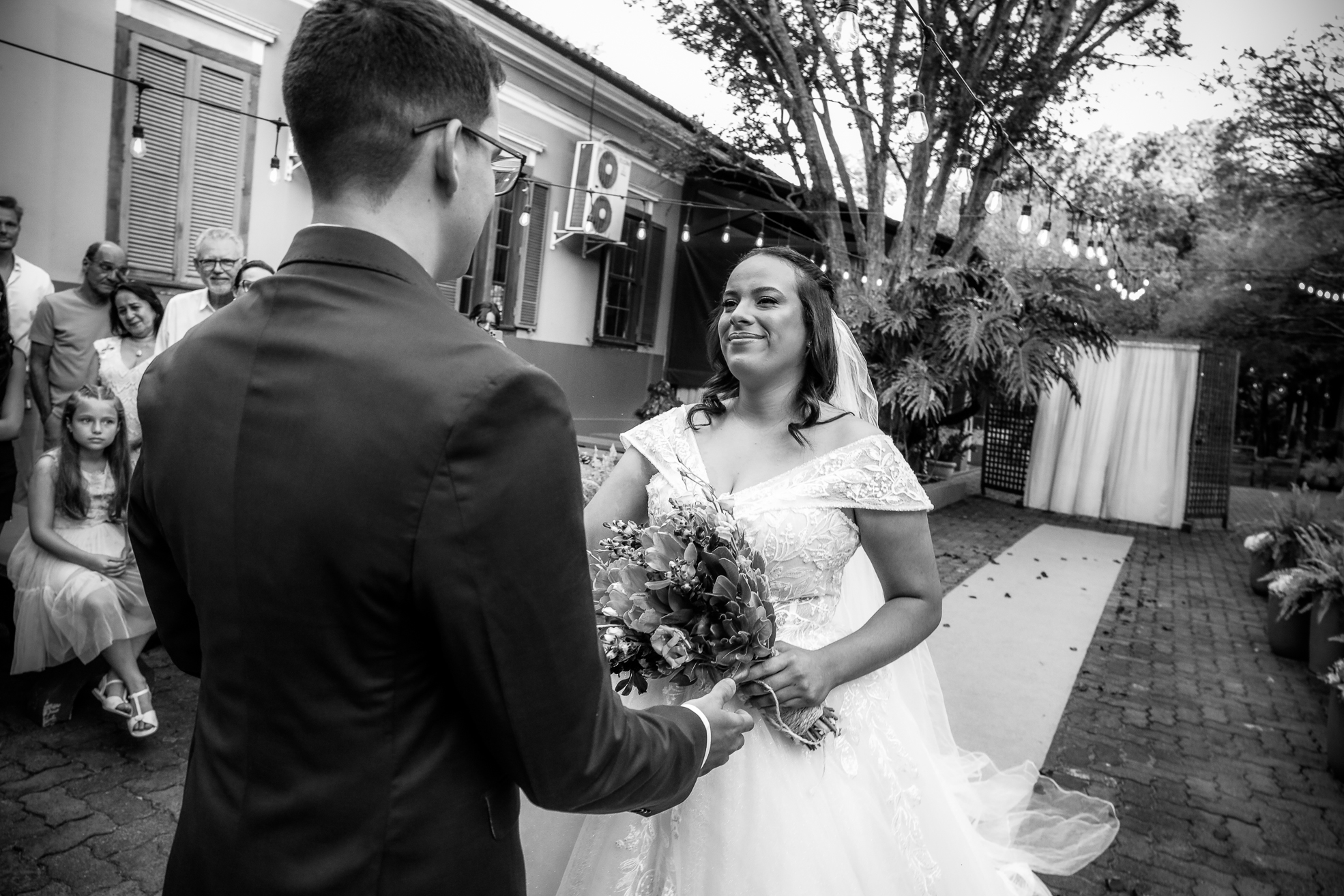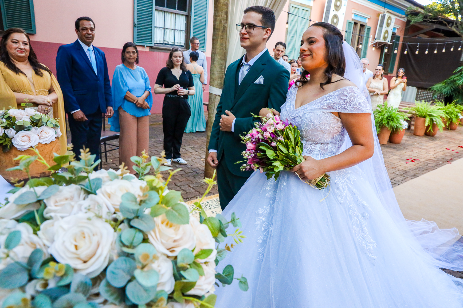 A Ana estava nervosa no começo, até chorou antes de entrar na cerimônia, mas assim que viu o Eduardo, tudo se encaixou e ela sorriu.