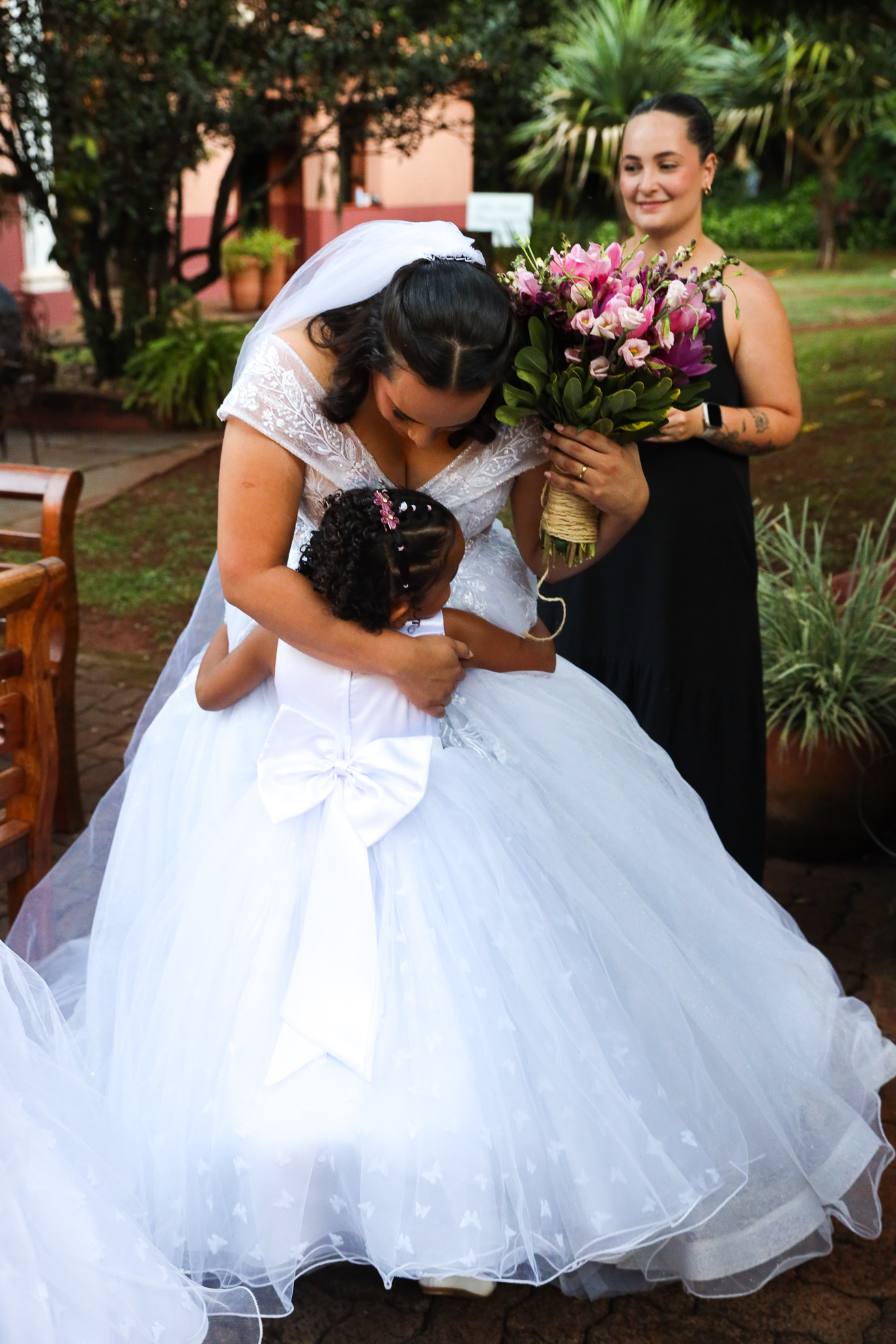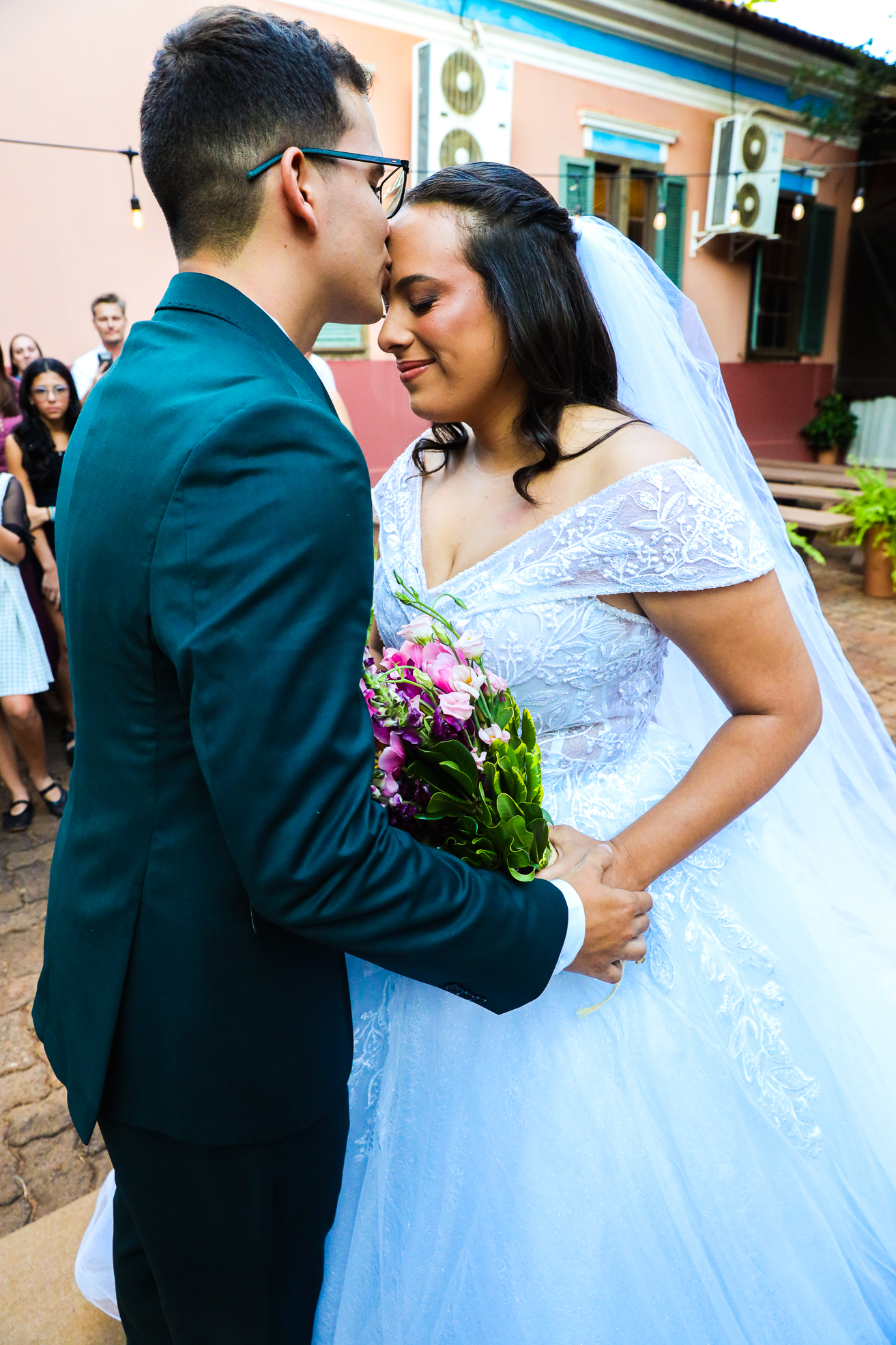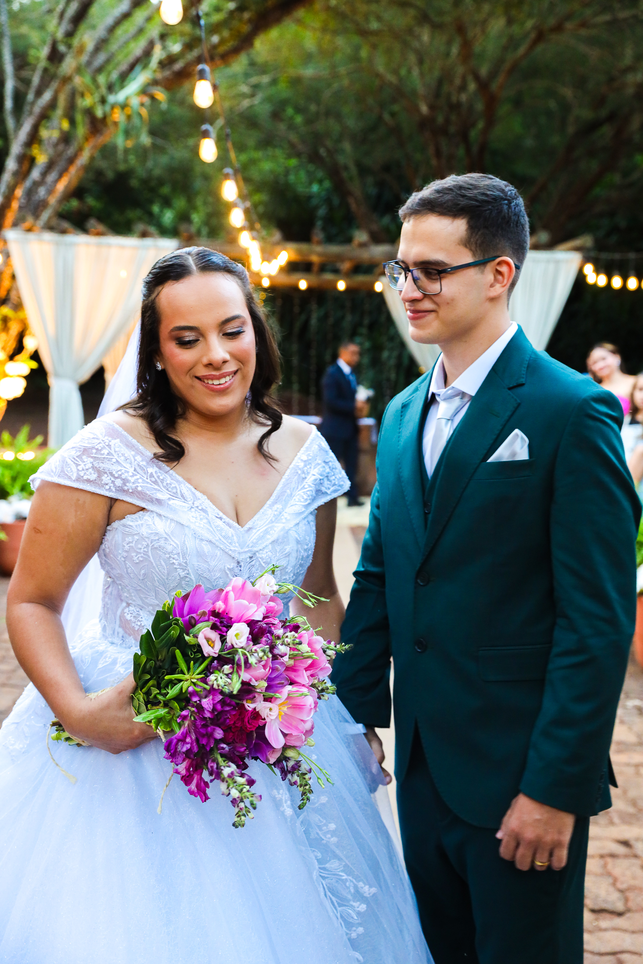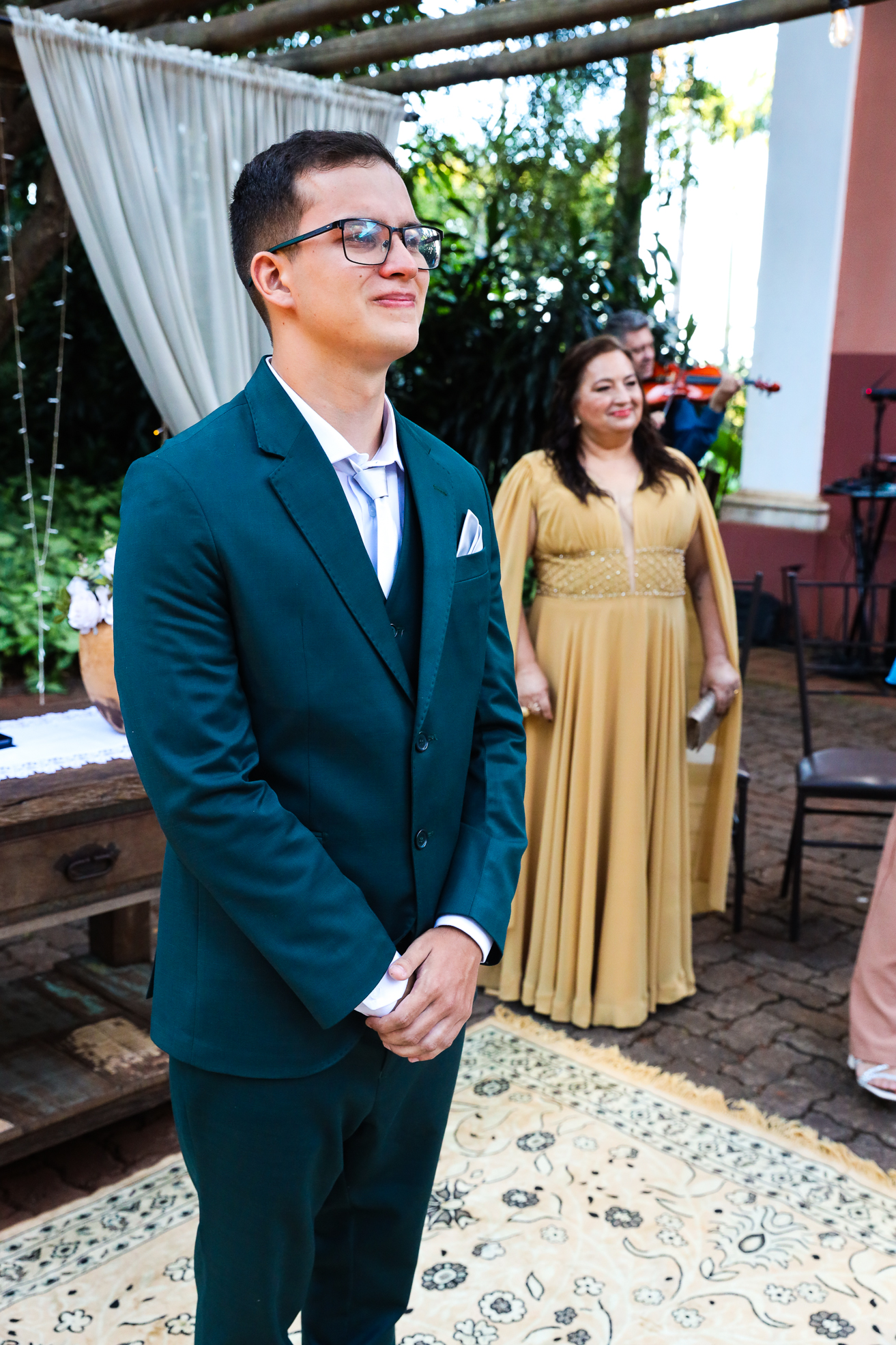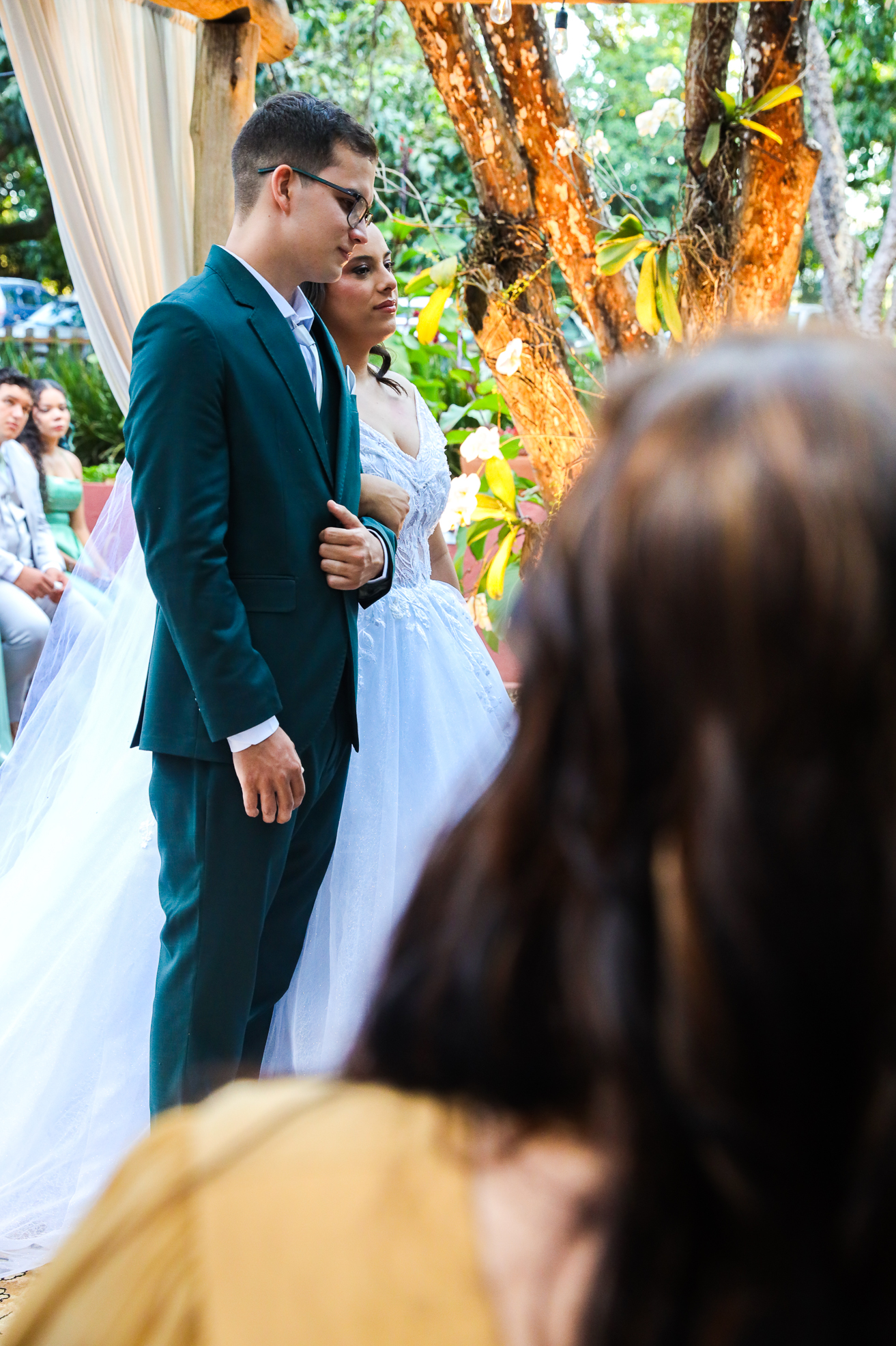 A Ana estava nervosa no começo, até chorou antes de entrar na cerimônia, mas assim que viu o Eduardo, tudo se encaixou e ela sorriu.