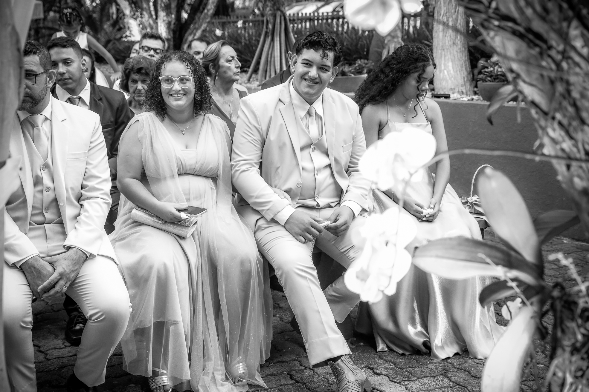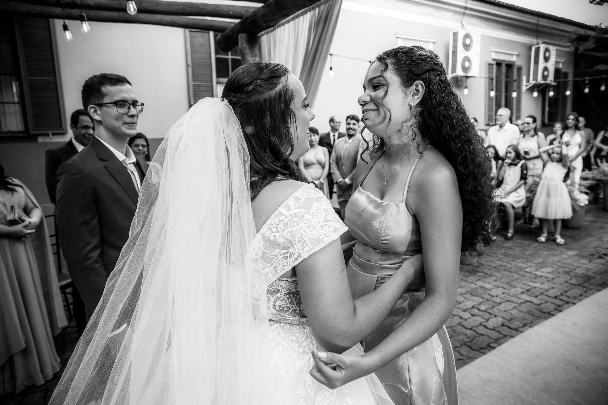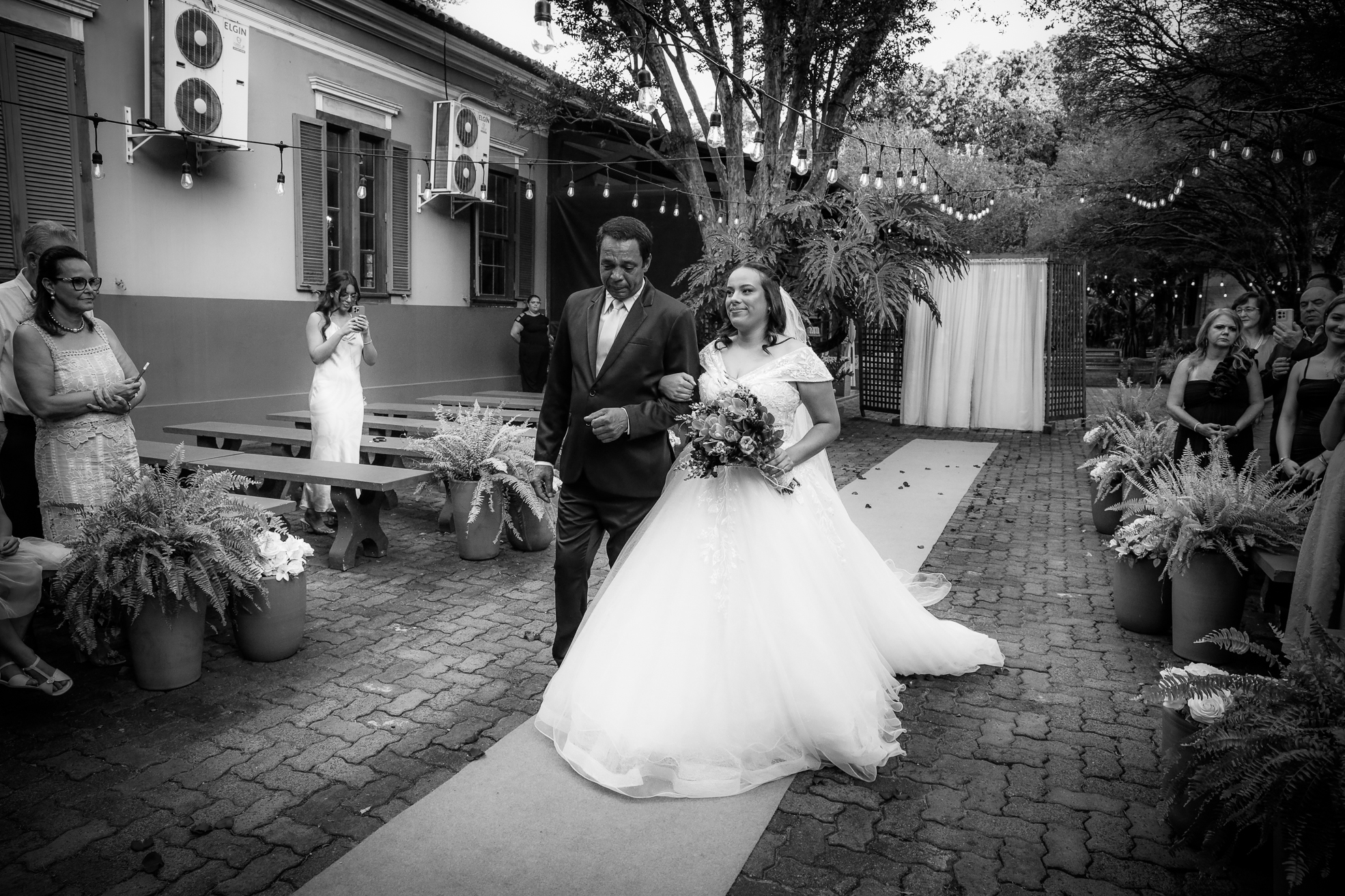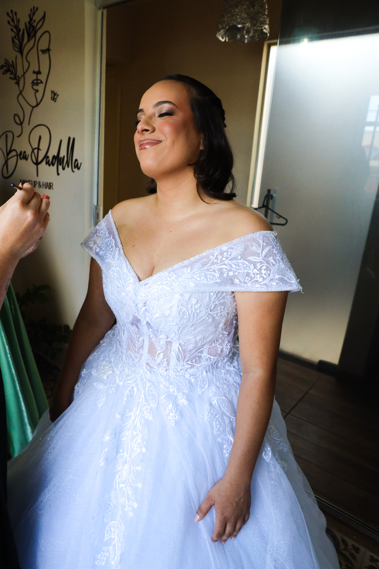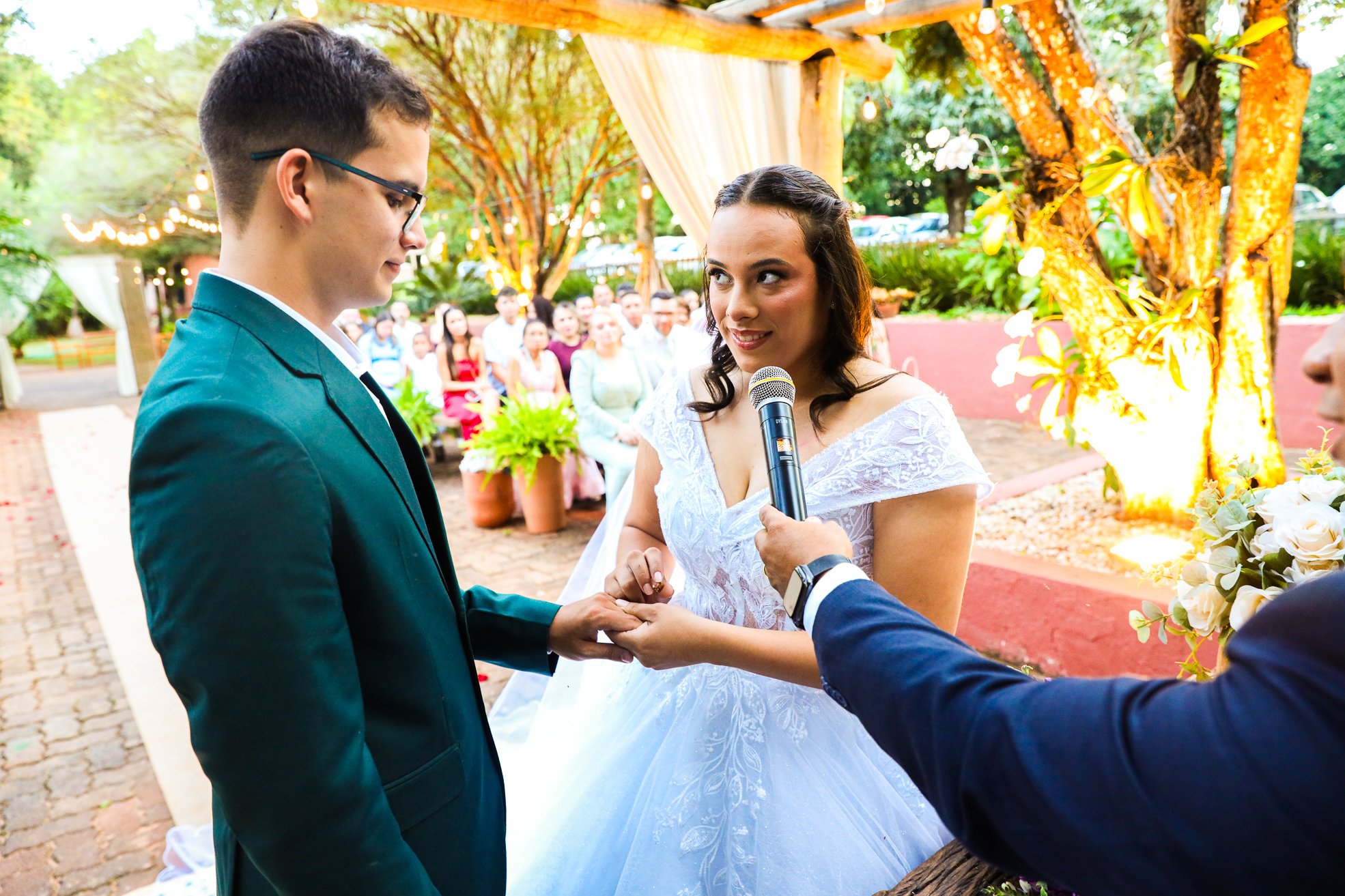 A Ana estava nervosa no começo, até chorou antes de entrar na cerimônia, mas assim que viu o Eduardo, tudo se encaixou e ela sorriu.