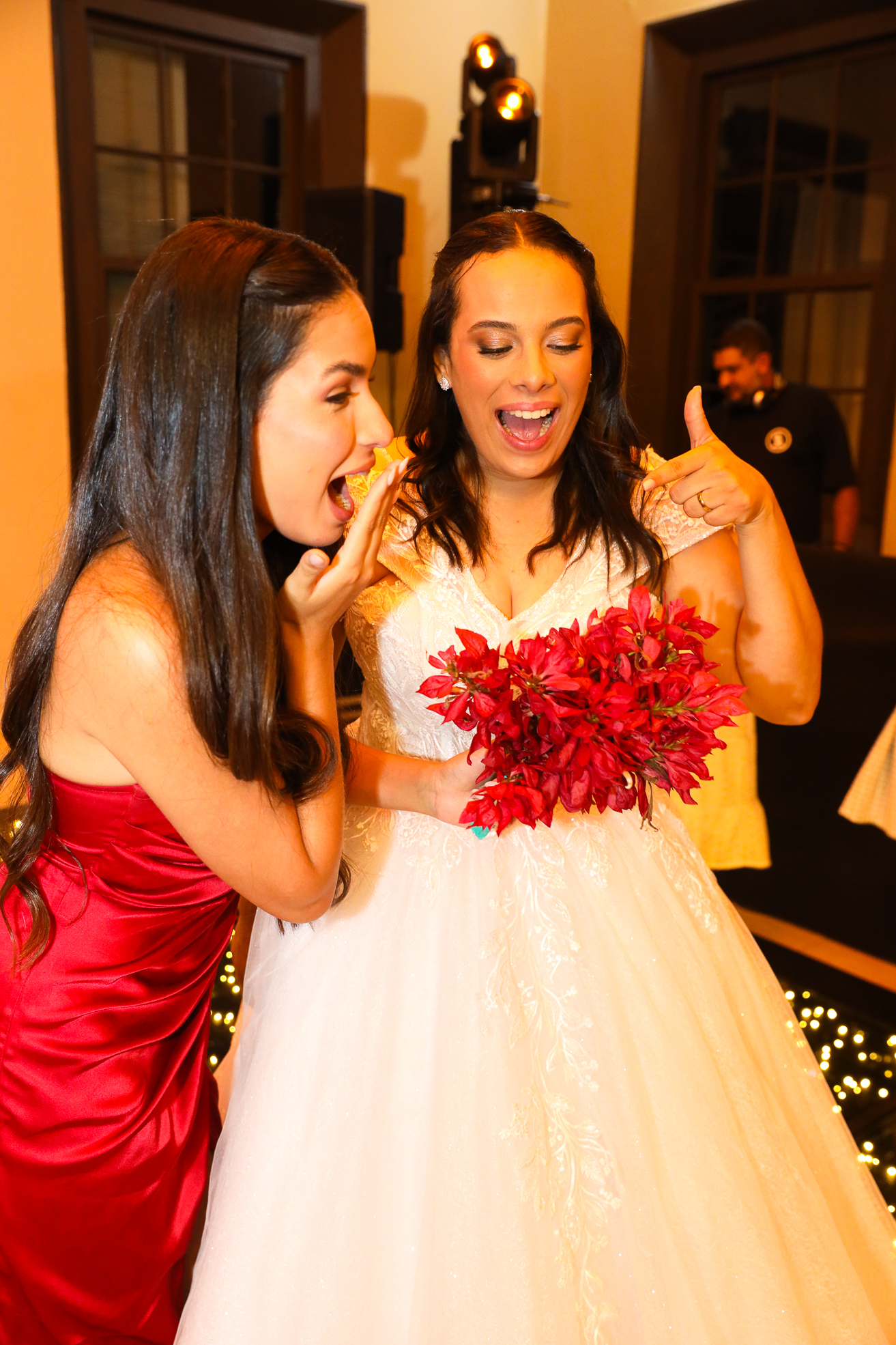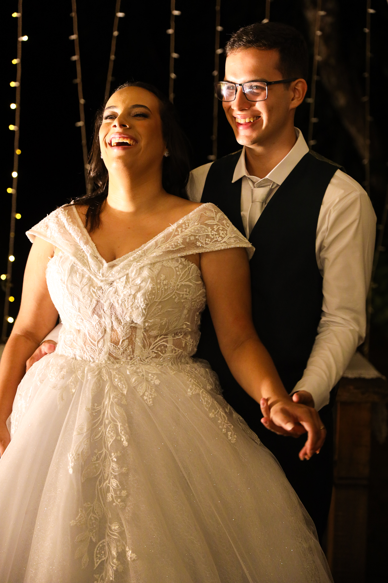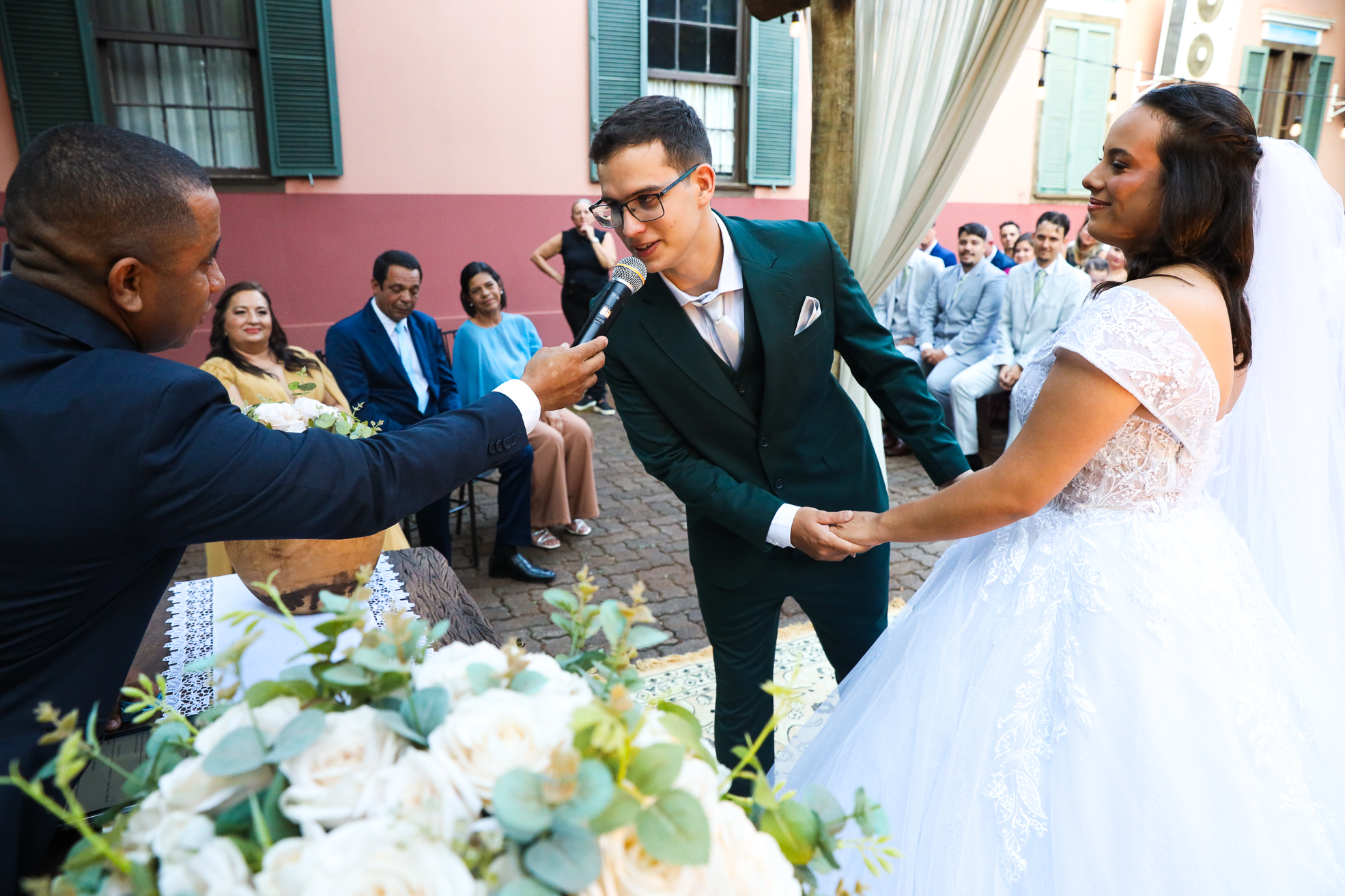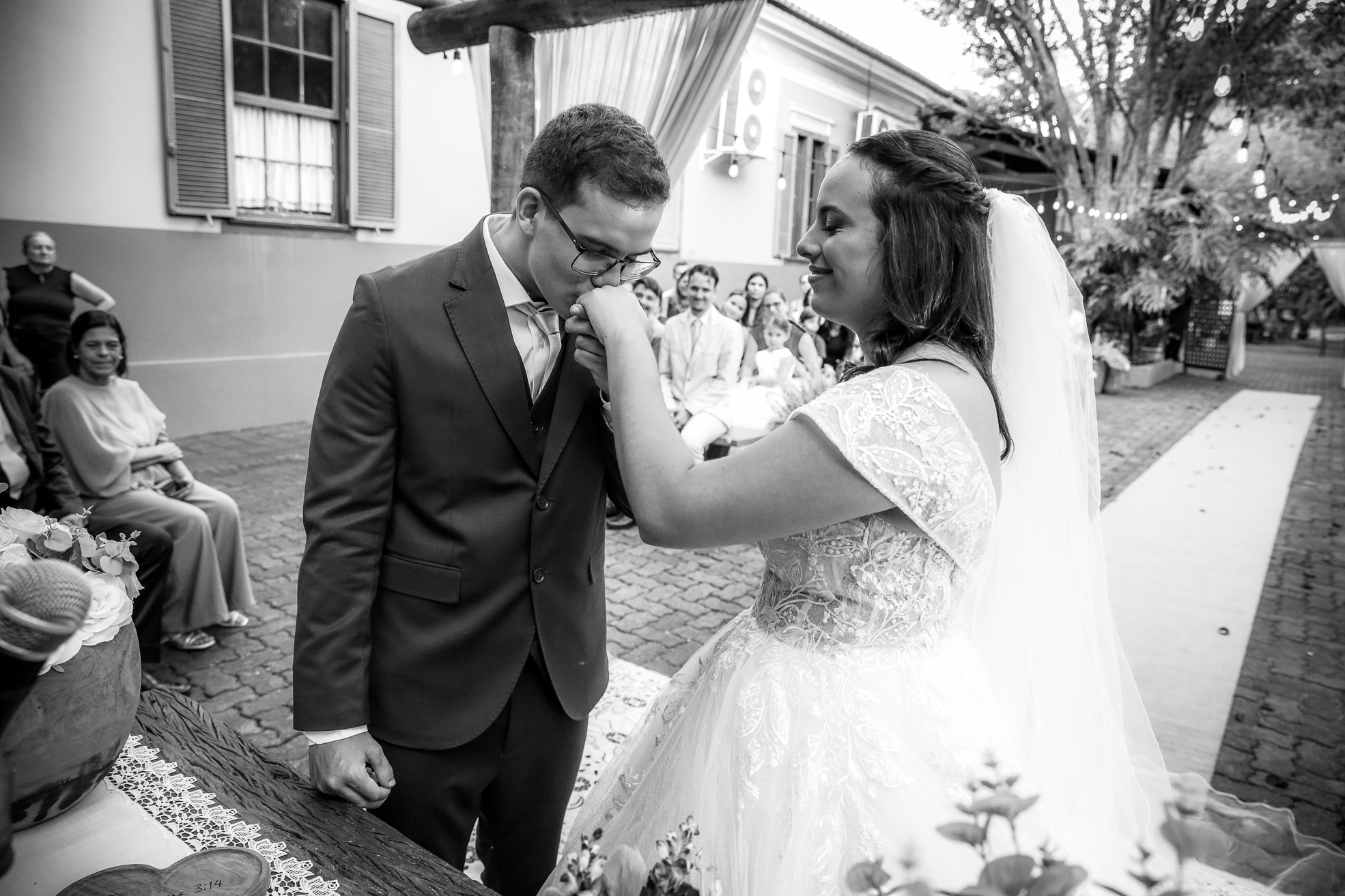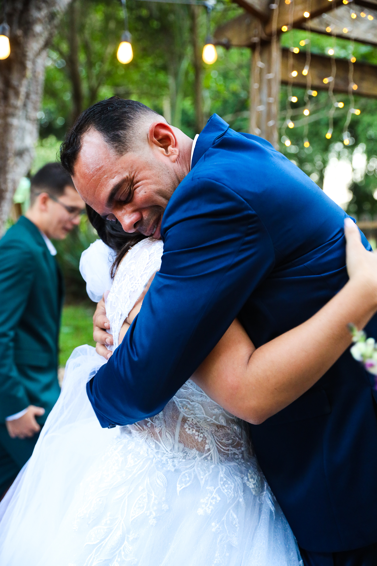 A Ana estava nervosa no começo, até chorou antes de entrar na cerimônia, mas assim que viu o Eduardo, tudo se encaixou e ela sorriu.