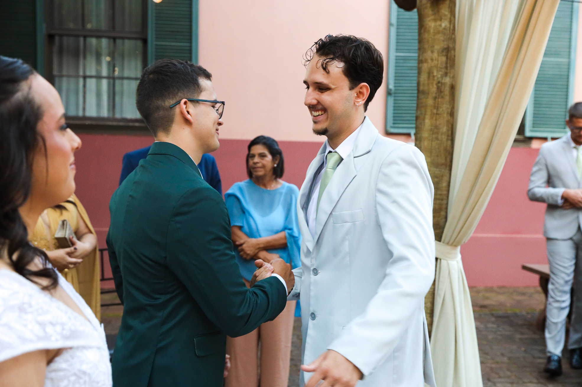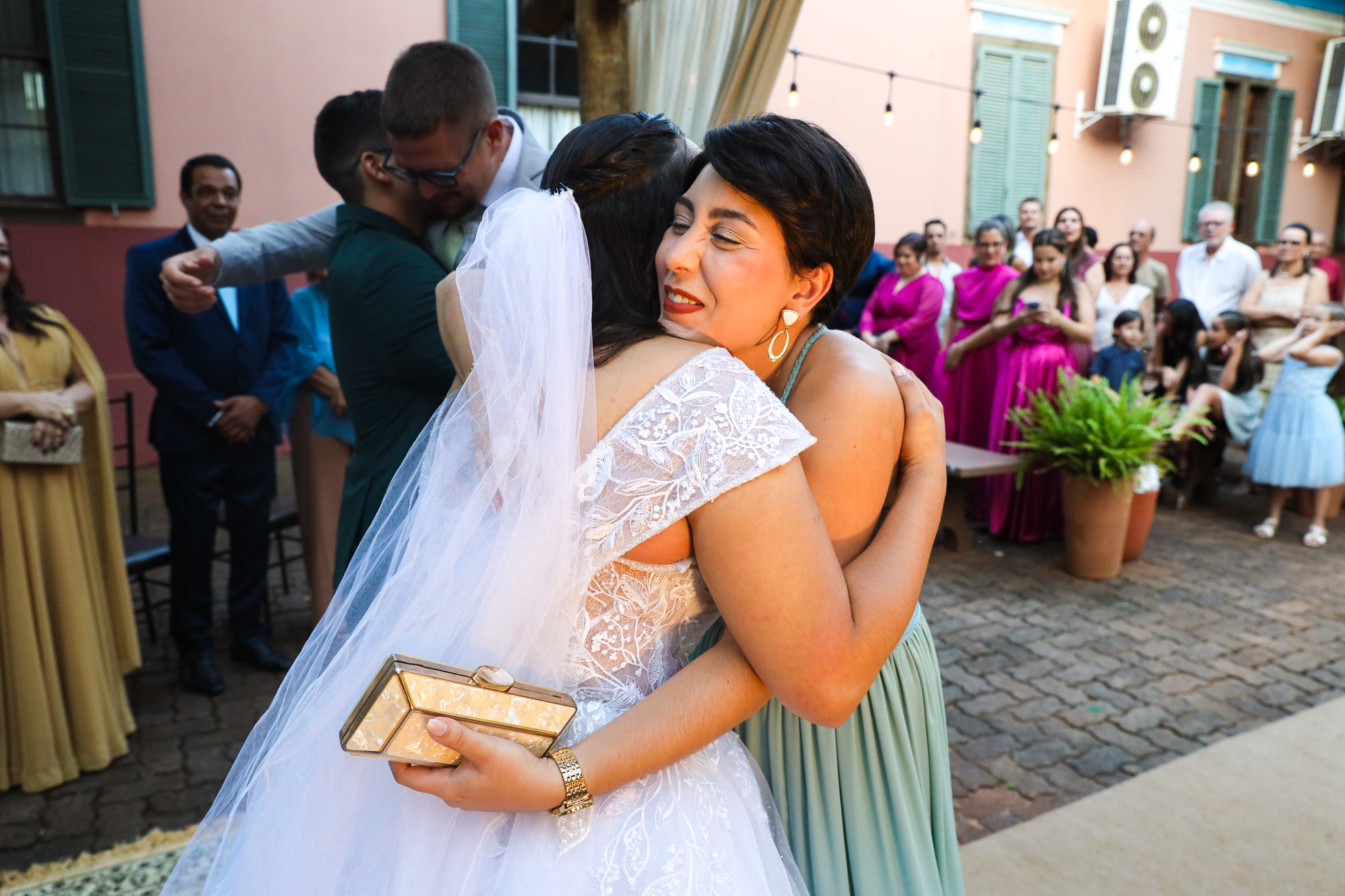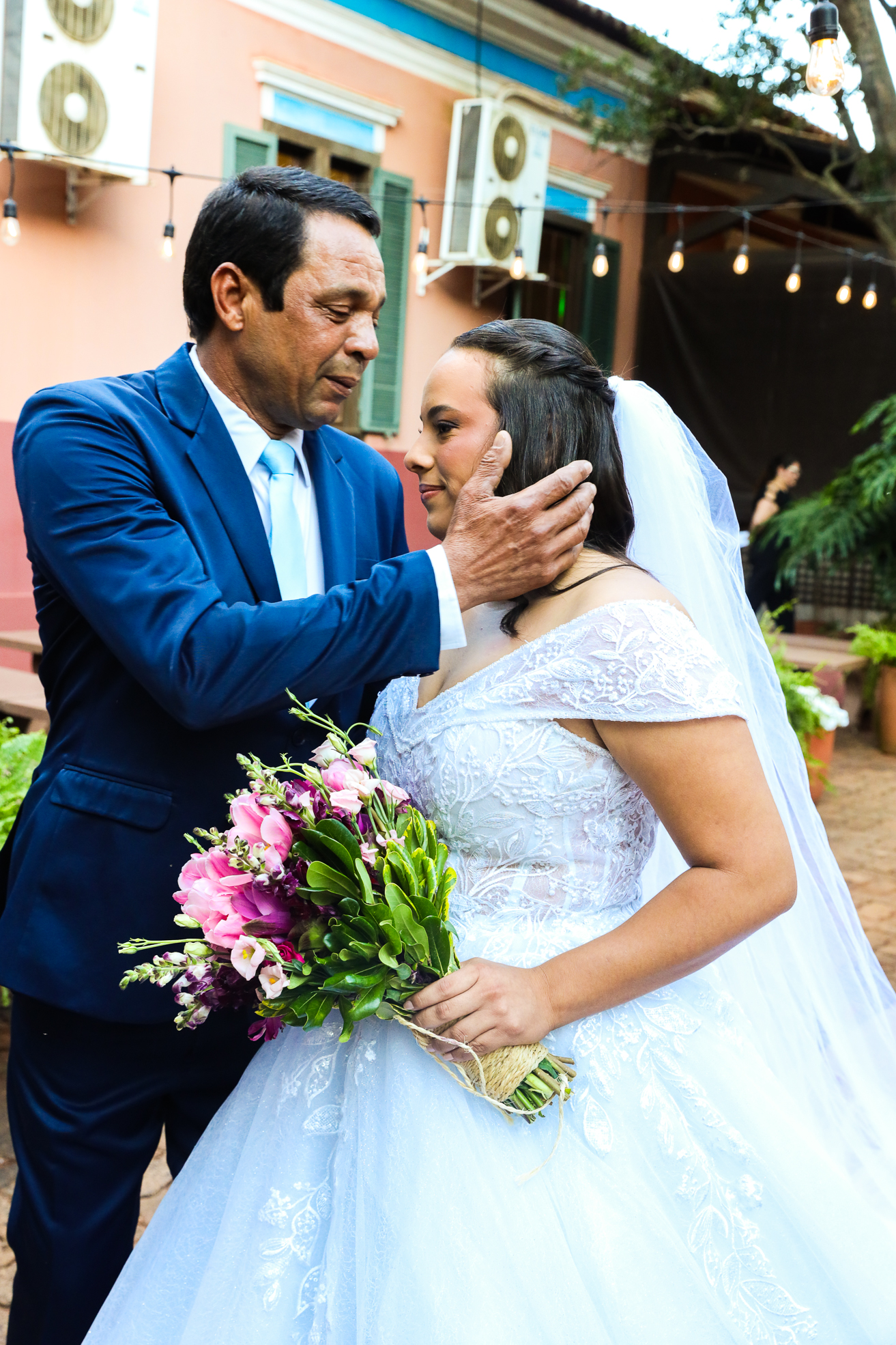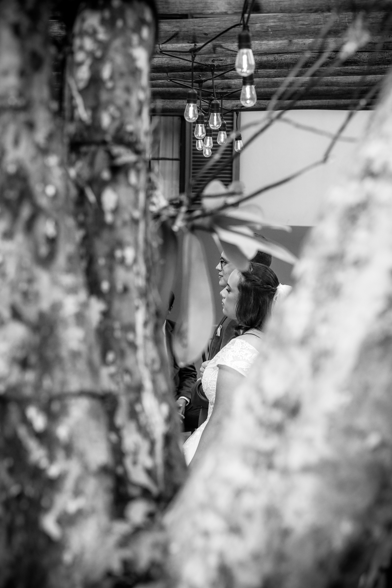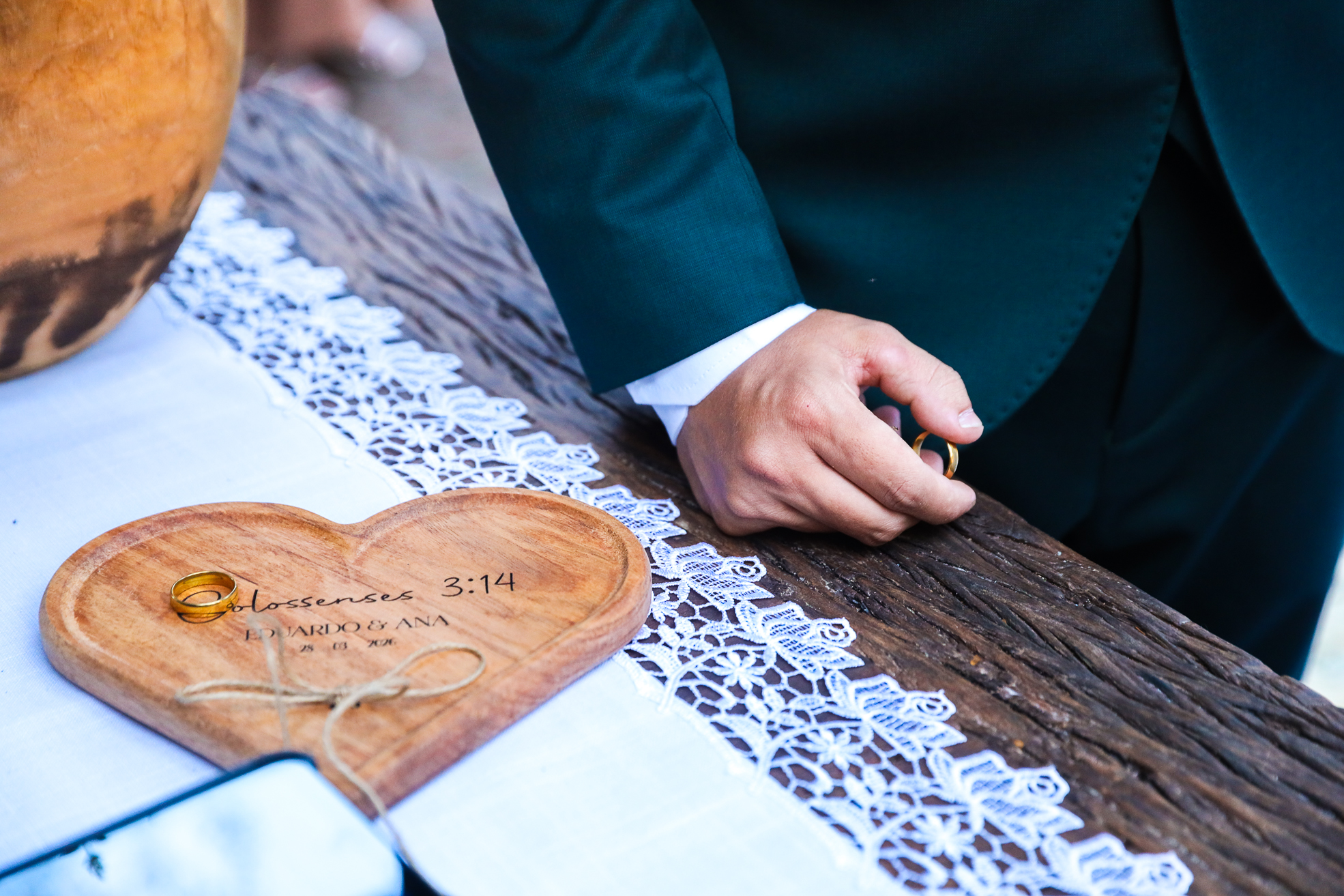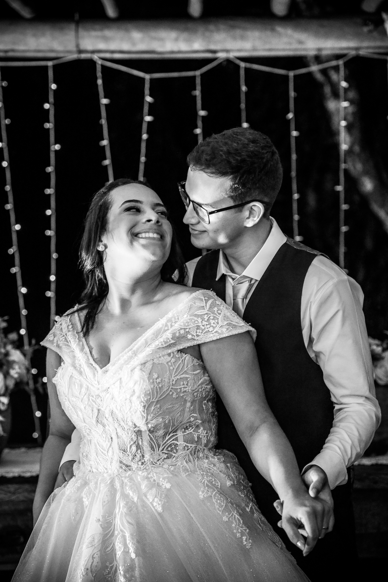A Ana estava nervosa no começo, até chorou antes de entrar na cerimônia, mas assim que viu o Eduardo, tudo se encaixou e ela sorriu.