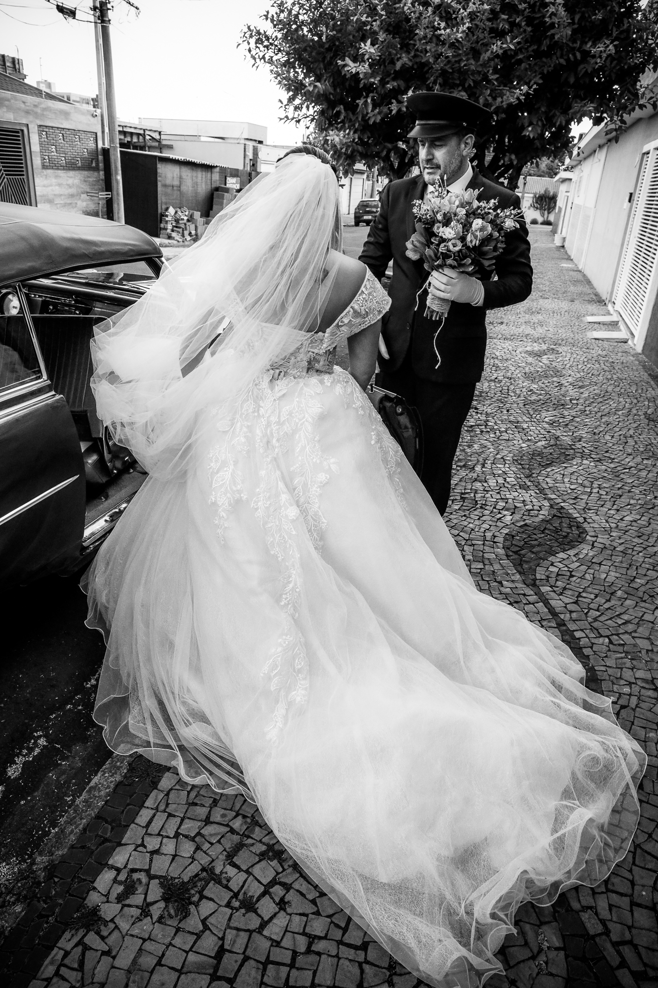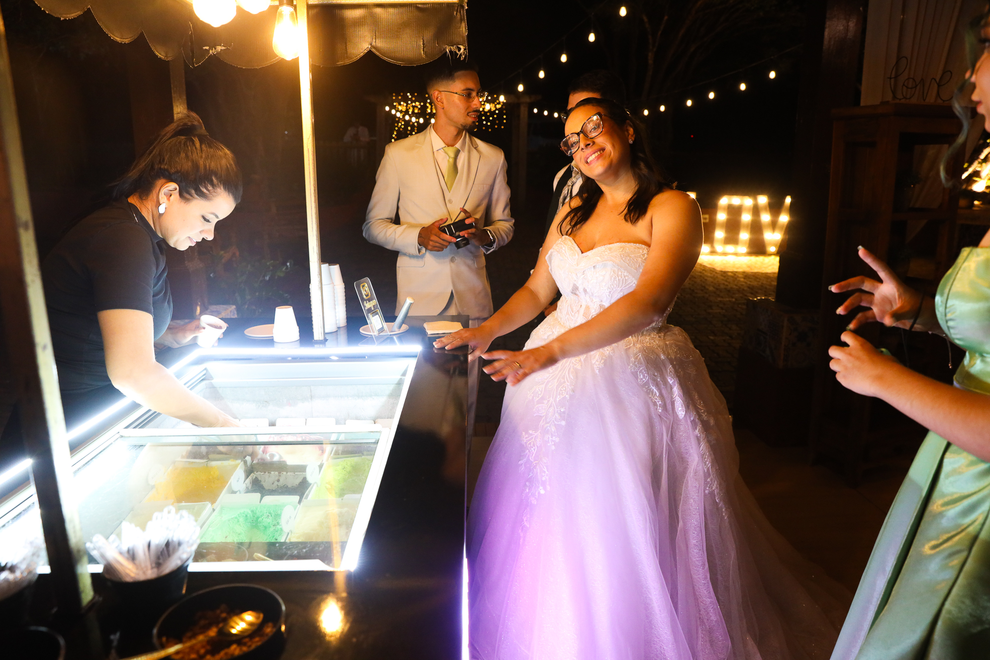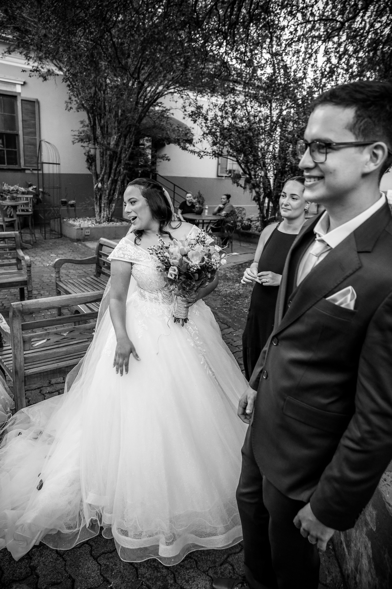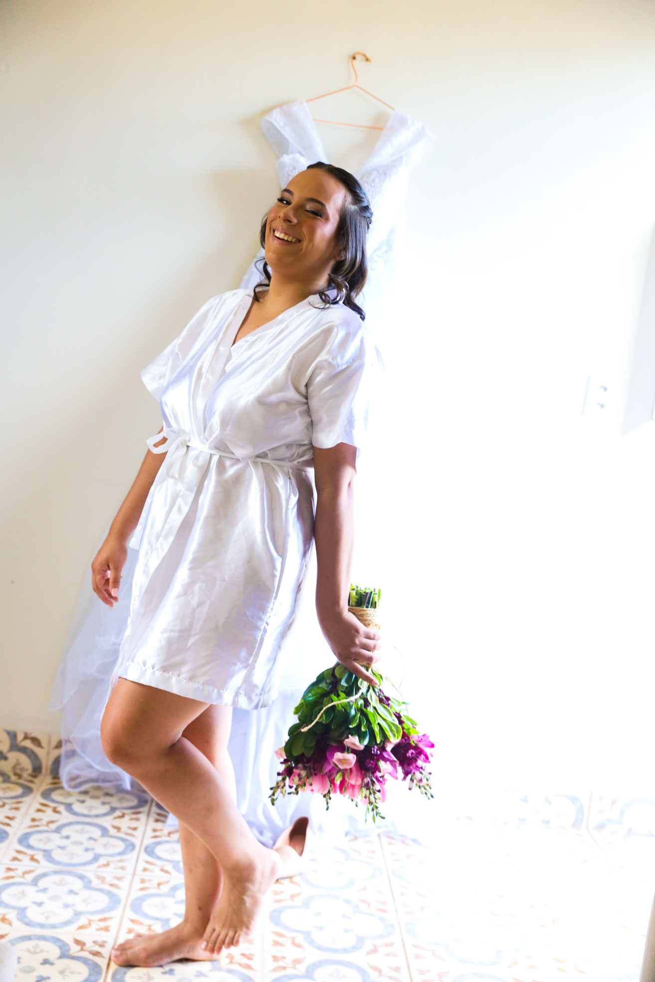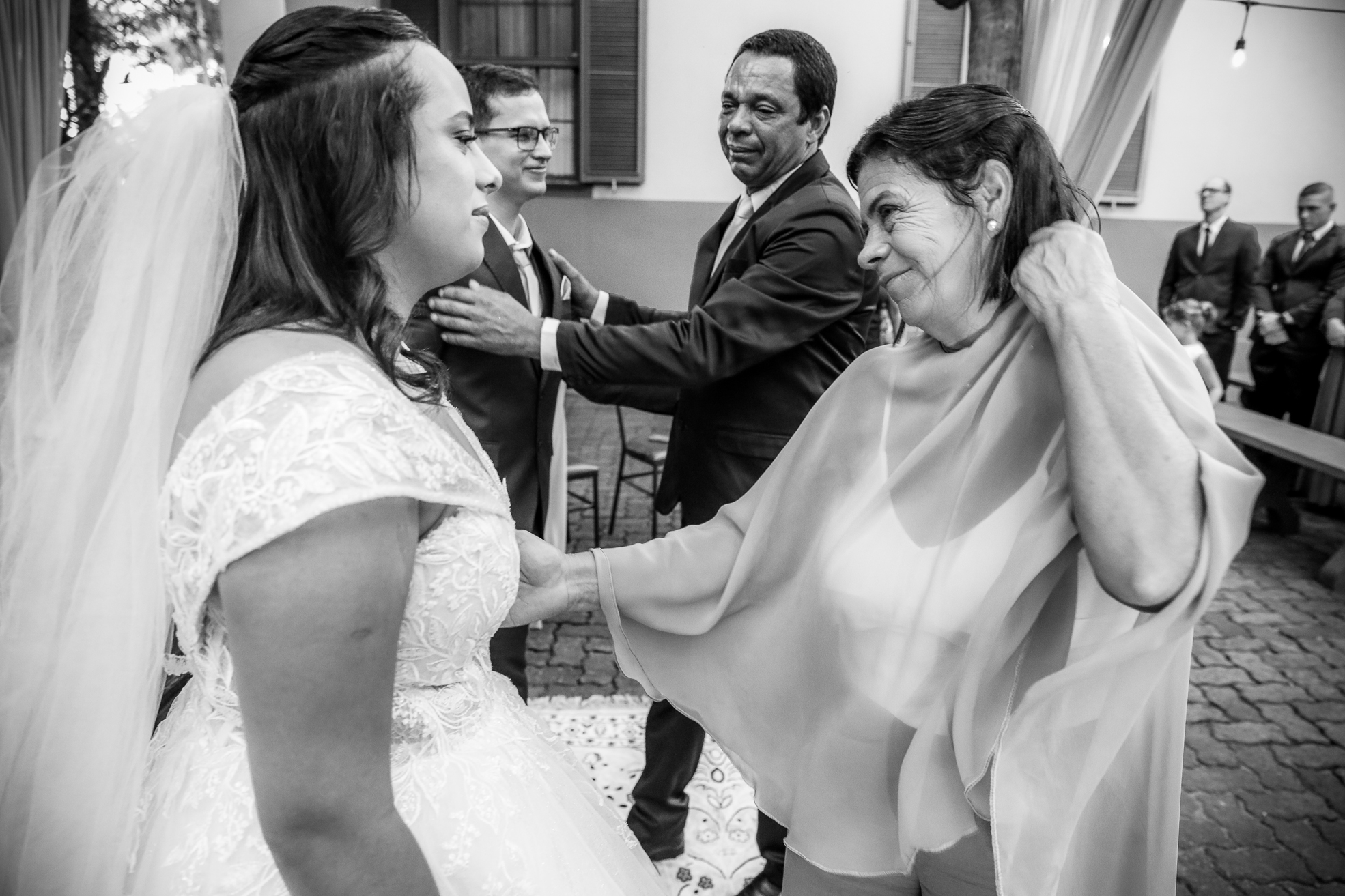 A Ana estava nervosa no começo, até chorou antes de entrar na cerimônia, mas assim que viu o Eduardo, tudo se encaixou e ela sorriu.